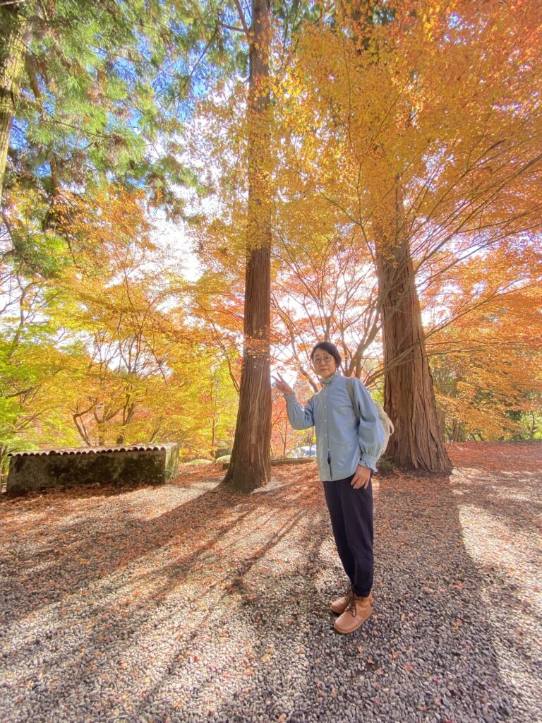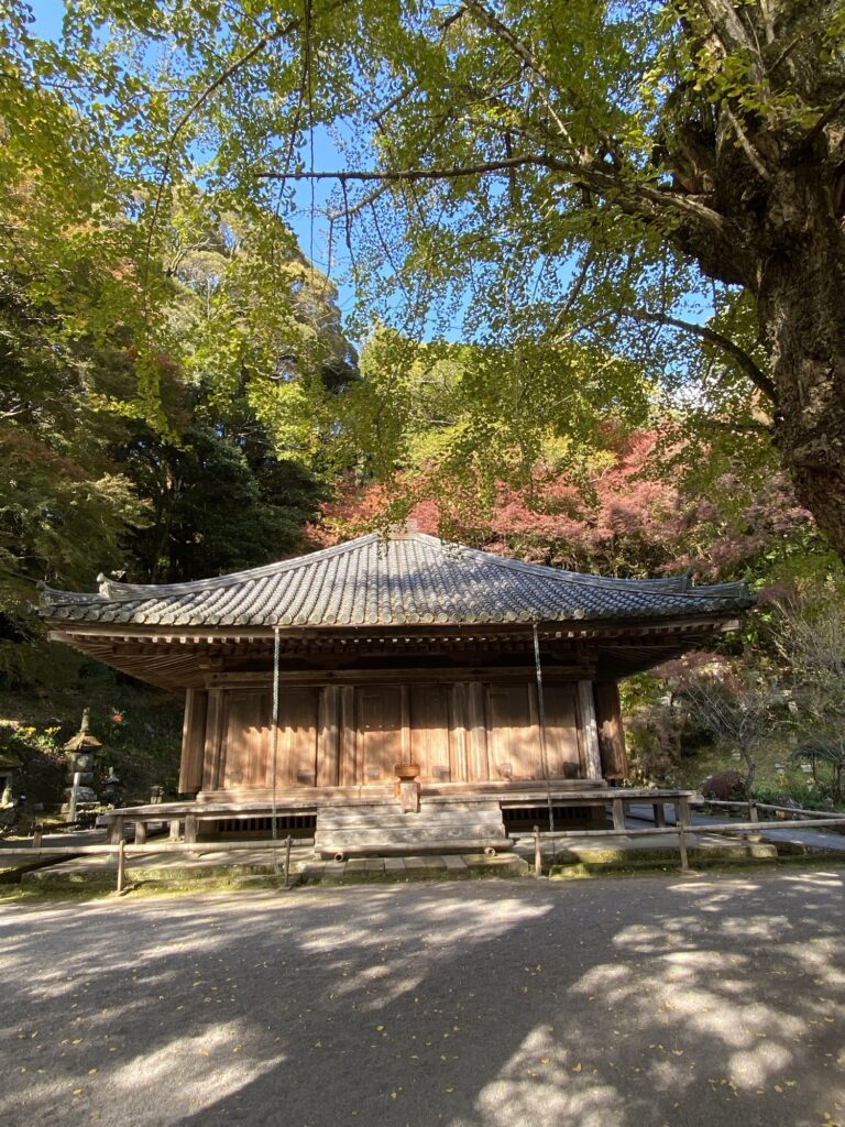 富貴寺では国宝の阿弥陀堂が紅葉に包まれ、